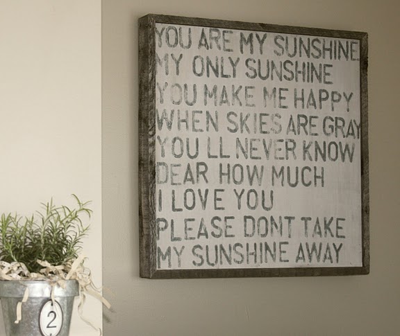 We are thinking a lot about art for the nursery, and I have always wanted to display the song "You are my Sunshine" since it's the song I remember my mother singing to me most. My favorite sign on Etsy would have to be this cheerful one, although it's much too girly. Don't you think?